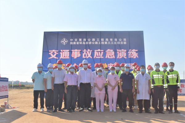 十公司海南环岛旅游公路项目以“自卸车辆与面包车在交叉路口相撞造成交通事故”为背景开展交通事故应急救援演练。