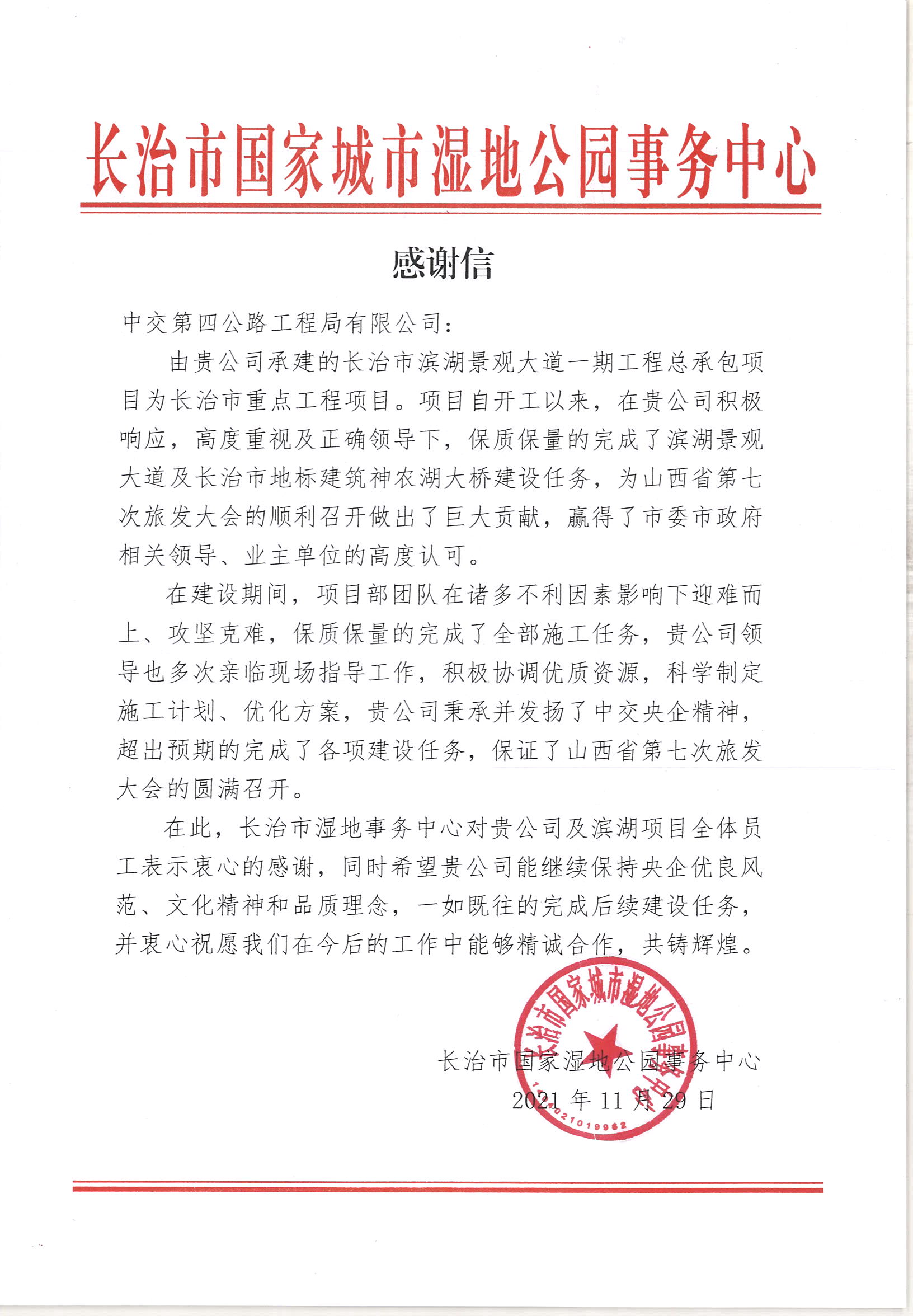 长治滨湖项目全体职工秉承着中交四公局“务实、高效、开拓、创新”的企业精神,在诸多不利因素影响下迎难而上、攻坚克难,积极协调优质资源、科学制定施工计划、合理优化施工方案,保质保量的交付了长治滨湖景观大道及长治市新地标神农湖大桥的建设任务,为山西省第七次旅发大会的顺利召开奠定了坚实基础。