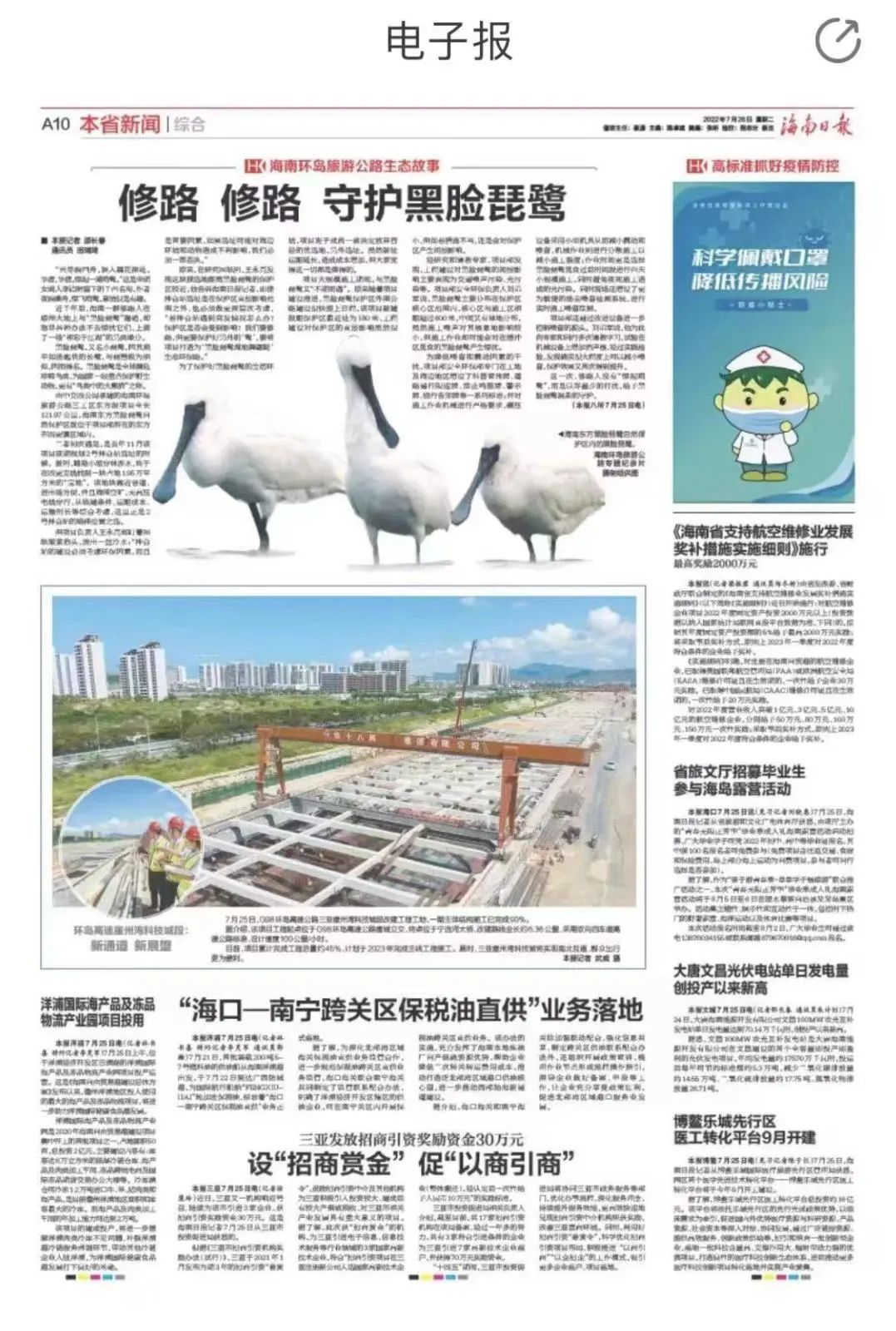 近日,《海南日报》第十版刊登了海南环岛旅游路项目环保主题稿件《修路 修路 守护黑脸琵鹭》。文章主要讲述了海南环岛旅游路项目团队两次与国家一级重点保护野生动物“黑脸琵鹭”“相遇”所采取的一系列保护措施。