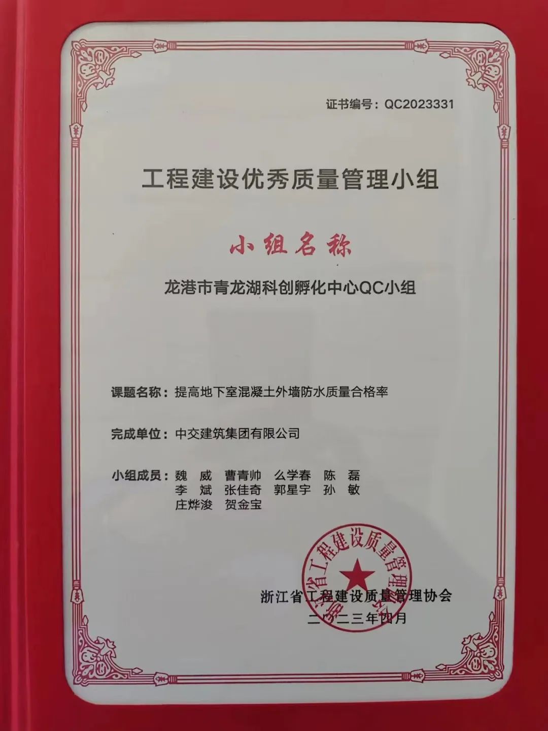 近日,浙江省工程建设质量协会组织召开2023年浙江省工程建设QC成果交流学习会,龙港项目“青龙湖科创孵化中心QC小组”结合项目情况从材料品质控制、施工工艺优化、人员素质培养三个方面分享交流了关于提高地下室混凝土外墙防水质量合格率的经验成果。该成果受到协会专家的一致好评,荣获了浙江省工程建设质量管理协会授予的“工程建设优秀质量管理小组”荣誉。