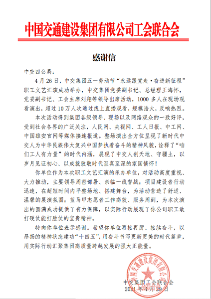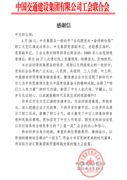 4月29日,中交集团工会联合会向四公局发来两封感谢信,感谢四公局助力中交集团成功举办五一劳动节“永远跟党走•奋进新征程”职工文艺汇演活动。