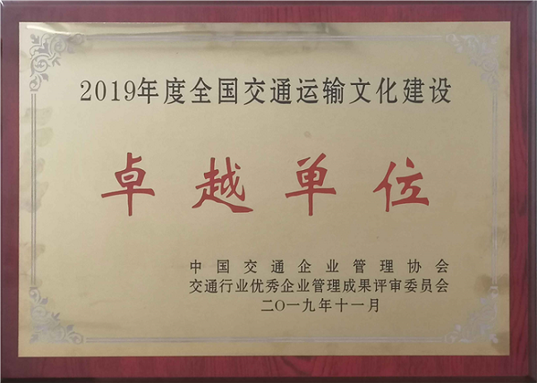 为深入学习贯彻习近平新时代中国特色社会主义思想和党的十九大,十九届二中、三中、四中全会精神,培育和践行社会主义核心价值观,展示新中国成立70年来交通运输文化建设成果和交通职工的精神风采,推进优秀交通运输文化传承创新,推动新时代交通运输行业软实力建设,助力交通强国建设,根据《关于组织申报2019年度全国交通运输文化建设优秀成果的通知》(中交企协发字[2019]19号)要求,在有关单位积极申报推荐的基础上,按照《全国交通运输文化建设优秀成果评审标准》,经专家认真严格评审、公示、终审等工作程序,中国交通企业管理协会组织评定中交第四公路公程局有限公司为“2019年度全国交通运输文化建设卓越单位”,并颁发获奖证书。