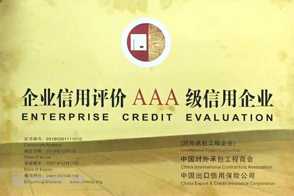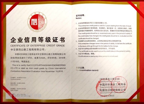 今年7月,集团下达了《关于积极参加对外承包工程企业信用评价工作的通知》,在局领导的支持和各部门的积极配合下,国际分公司按照中国对外承包工程商会的要求提交了评价资料。经过对企业基本状况、经营状况、财务状况、信用记录等方面的考察,四公局被评为对外承包工程企业信用AAA等级企业。