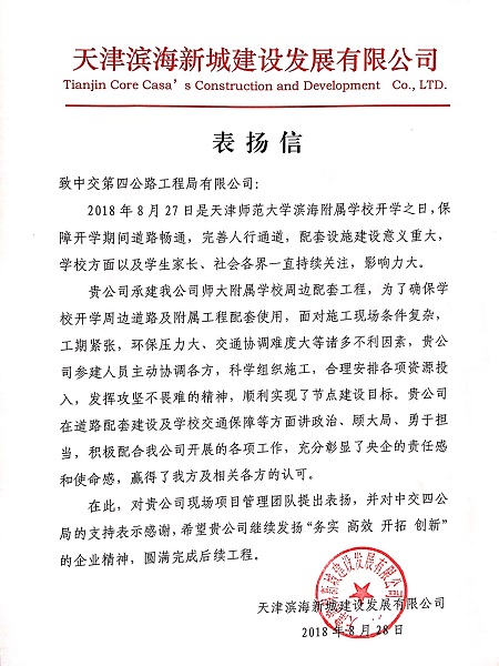 8月28日,四公局收到天津滨海新城建设发展有限公司发来的表扬信,对六公司天津师范大学附属配套项目部为天津师范大学滨海附属学校配套设施建设所做出的努力表示衷心感谢。