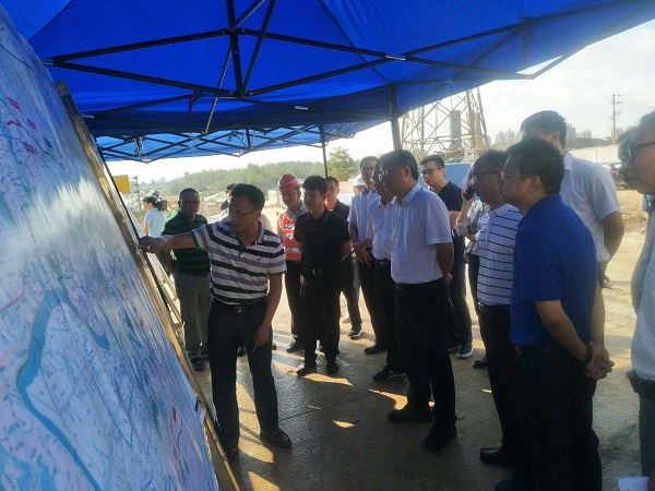 6月19日,广西壮族自治区党委委员、南宁市委副书记、市长周红波到桥隧公司邕武立交项目检查指导工作。南宁市兴宁区常务副区长莫滨、南宁市纵横时代建设有限公司董事长黄民源、副总经理黄超燃等陪同检查。