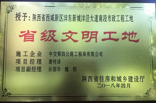 近日,在投资事业部西咸项目公司、总承包公司西咸总项目经理部、五公司沣泾大道南段项目经理部各参建人员的共同努力下,西咸新区沣东新城沣泾大道南段市政工程项目荣获陕西省住房和城乡建设厅“省级文明工地”称号。