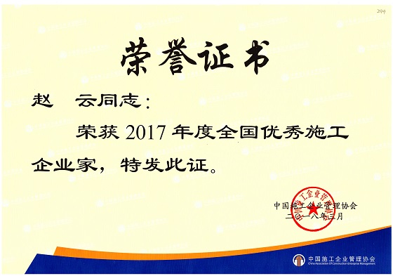 4月20日,由中国施工企业管理协会组织评选的2017年度“全国优秀施工企业家”揭晓,四公局董事长、党委书记赵云再次获评“全国优秀施工企业家”荣誉称号。