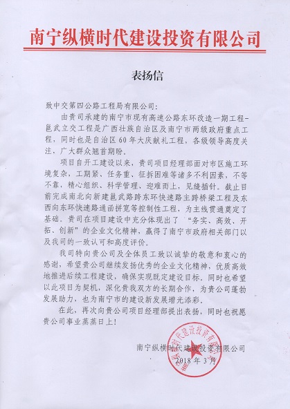 四公局收到南宁纵横时代建设投资有限公司表扬信