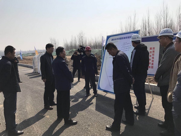 3月22日,廊坊市政府副市长、党组成员王凯军到三公司廊坊外环项目施工现场检查指导工作。