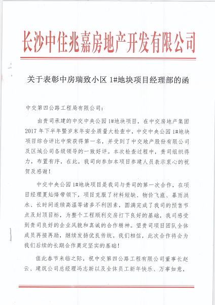 2月6日,长沙中住兆嘉房地产开发有限公司向四公局发来表彰函,对建筑公司长沙项目在中交地产股份有限公司2017年下半年安全质量检查综合评比中获得第一名进行表彰。