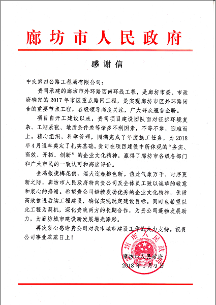 感谢信中表示,由投资事业部负责管理、三公司承建的廊坊市外环路西南环线工程作为廊坊市委、市政府确定的2017年市区重点工程,受到了各级领导和广大群众的高度关注。项目自开工建设以来,四公局作为项目的建设单位,克服了征拆环境复杂、工期紧张、地址条件不利等诸多不利因素,不等不靠,迎难而上,精心组织,科学管理,圆满完成了年度施工任务,为2018年4月通车奠定了扎实的基础。同时廊坊市政府希望四公局可以继续发扬“务实高效,开拓创新”的特色企业文化,优质高效地推进后续工程建设,并以此工程为契机,深化双方的长期合作,实现双方共赢。