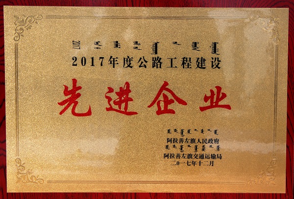 1月5日,阿拉善左旗人民政府、阿拉善左旗交通运输局授予四公局“2017年度公路工程建设先进企业”荣誉称号,并授予一公司英雄会项目经理张子良同志为“2017年度公路工程建设先进个人”。