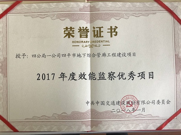 四公局一公司四平地下综合管廊工程建设项目被确定为 “中国交建2017年效能监察联系点”,立项内容为“变更签证计价”。通过效能监察活动的开展,四平管廊项目取得了较好的经济效益与管理效益,不仅在2017年年终检查中获得了中国交建的高度评价,同时也为其他项目开展效能监察活动起到了一定的示范作用。