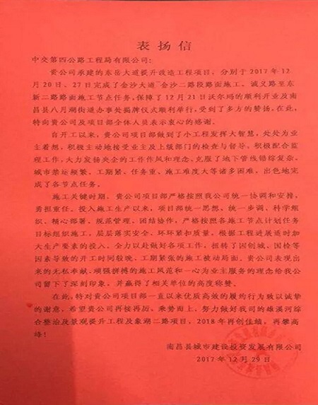 2017年12月29日,南昌市南昌县城市建设投资有限公司致信四公局,对四公局为南昌县东岳大道项目建设作出的努力提出表扬和衷心感谢。