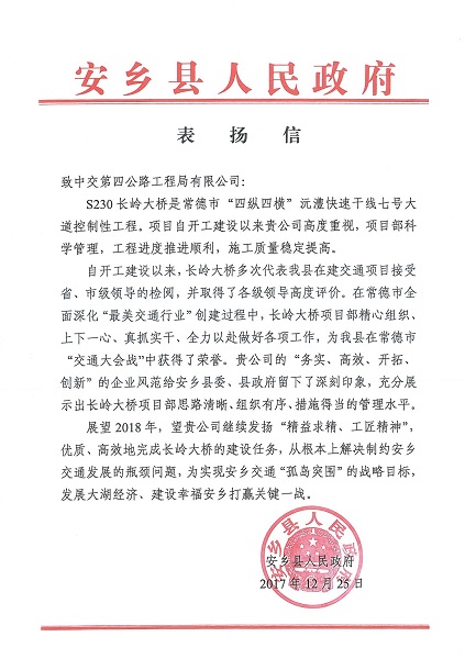 2017年12月25日,湖南省常德市安乡县人民政府向四公局发来表扬信,对四公局“务实高效,开拓创新”的特色企业文化表示赞赏,对企业科学管理、六公司安乡长岭大桥项目工程进度有序推进、施工质量稳定提高表示认可。