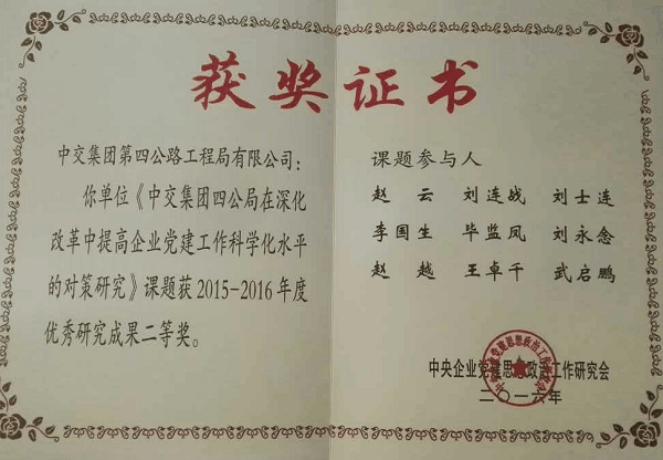 日前,四公局党委申报的一项党建研究课题《中交集团四公局在深化改革中提高企业党建工作科学化水平的对策研究》课题荣获中央企业党建思想政治工作2015-2016年度优秀研究成果二等奖。这是四公局党委党建研究工作取得的又一项重要成绩。据悉,该课题还将作为教学工具书被大连干部学院采用。
