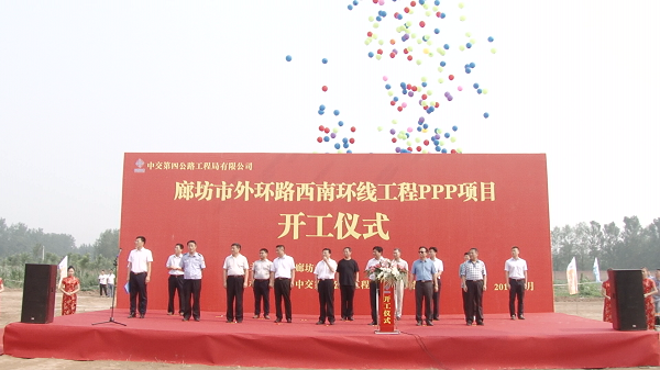6月28日,河北省廊坊市外环路西南环线工程开工仪式在廊坊市西南环线施工现场举行,廊坊市副市长王凯军、市政府副秘书长李春、建设局局长张海川,四公局党委委员、董事、副总经理许宝忠、三公司主持工作的副总经理王鹏飞、投资事业部副总经理刘尚志,以及安次区政府、市规划局等17家单位参加了本次活动。