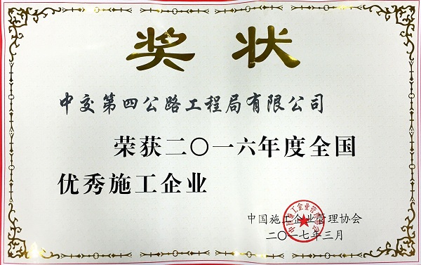 近日,经中国交建推荐,中国施工企业管理协会评审,四公局凭借优秀的经营业绩、先进的施工理念、科学的管理模式荣获2016年度“全国优秀施工企业”荣誉称号,这是四公局连续第九次获得此项荣誉。