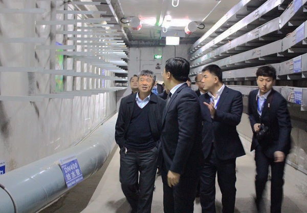 在管廊监控中心,调研组听取项目部总工程师胡浩方关于监控中心施工工艺、布置构造及各项功能的介绍,体验了管廊VR技术,并参观了解了水电仓、热力仓的布置构造;在管廊兴红路施工现场,调研组听取了胡浩方关于钢板桩支护、降水井等施工工艺的介绍,参观了已完工管廊段廊内实体工程,并就相关问题进行了交流。