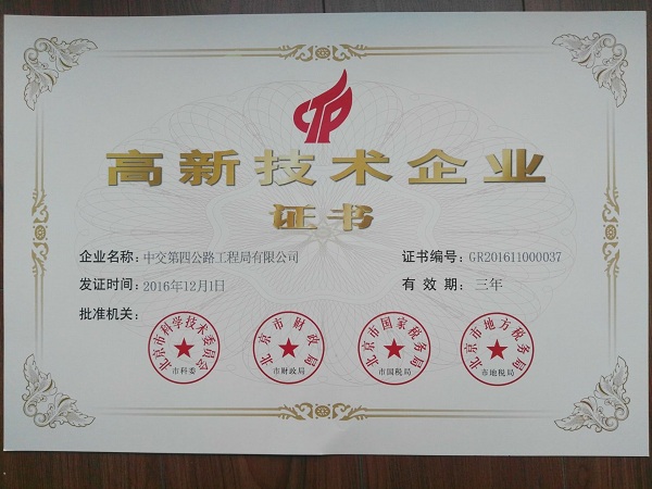 近日,四公局通过了北京市科学技术委员会、北京市财政局、北京市国家税务局和北京市地方税务局联合评审,再次被认定为“国家高新技术企业”,认定有效期为3年。期间,根据国家相关政策,获得“高新技术企业”认证企业将享受所得税减免10%优惠政策。