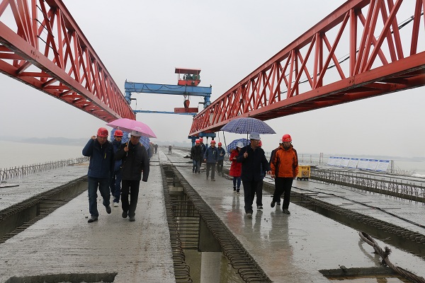 在南漪湖特大桥施工现场,罗宁听取了项目经理袁延浩关于项目进展情况的汇报,冒雨检查了施工质量、工程进度及安全文明生产情况。过程中,罗宁高度肯定了项目部取得的成绩,并对后续工作的开展提出四点要求:一是重视安全文明施工,保证安全生产;二是重视工程质量管理,抓好施工细节管控;三是规范施工,进一步加强标准化建设;四是倒排施工计划,细化节点目标,确保项目早日完工。