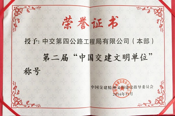 四公局获评第二届“中国交建文明单位”荣誉称号