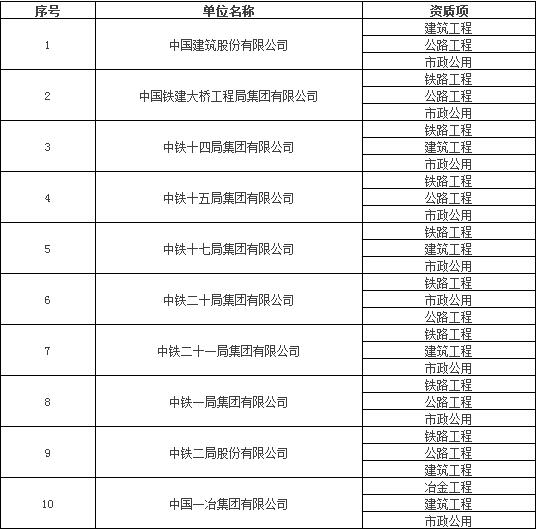 中铁十五局集团有限公司(铁路工程、公路工程、市政公用)、中国一冶集团有限公司(冶金工程、建筑工程、市政公用)新晋升为三特级行列,目前全国三特级企业,根据度川管理研究部(微信公众号:建筑管理)统计,共有十家,且全部为央企。