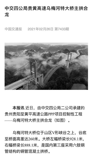 近日,中国交通报报道了二公司贵黄项目乌梅河特大桥主拱合龙情况。