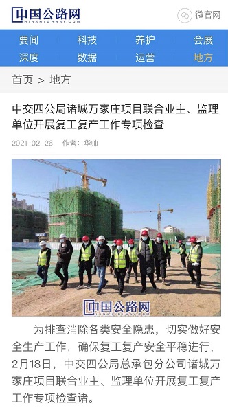 近日,中国公路网聚焦报道了总承包分公司诸城万家庄项目复工复产动态。