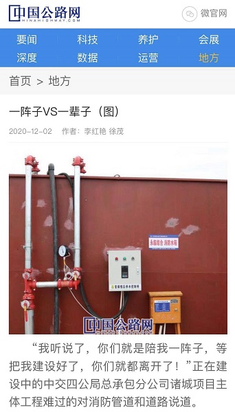 12月2日,《中国公路网》以“一阵子VS一辈子”为题,报道了总承包分公司诸城项目永临结合系列生产活动。