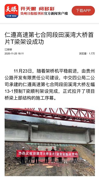 近日,贵州日报天眼对二公司仁遵7标项目田溪湾大桥首片T梁架设情况进行了报道。