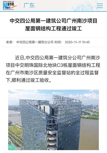 近日,新华网广东频道新闻栏目对第一建筑分公司中交明珠国际北地块项目C3栋屋面钢结构工程、节能工程通过竣工验收进行了采访报道。