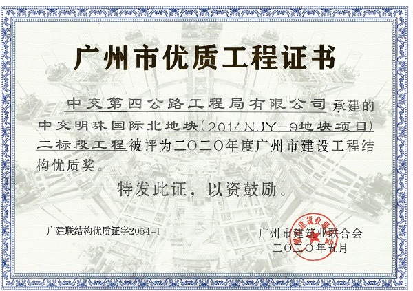 近日,中交明珠国际北地块项目获评2020年度广州市建设工程结构优质奖。