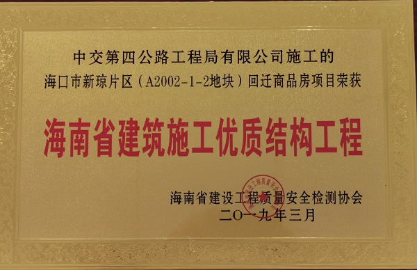 近日,由八公司承建的海口市新琼片区(A2002-2-1地块)回迁商品房项目荣获海南建设工程质量安全检测协会颁发的海南省建筑施工优质结构工程称号。
