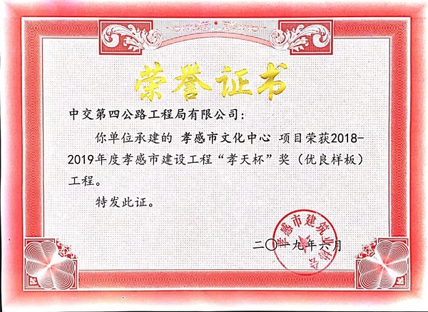 本次“孝天杯”奖的获得是四公局近年来创建品质工程的切实体现,也是创“鲁班奖”征程中重要的里程碑,为创优质工程奖奠定了基础,更是进一步提升了四公局在孝感市及湖北市场的品牌形象及企业核心竞争力。