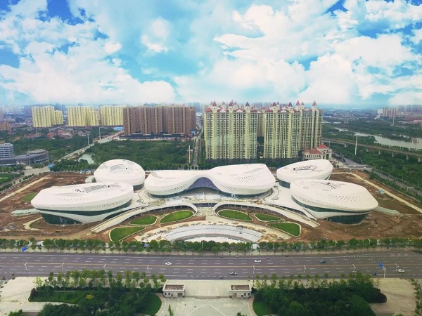 孝感市滚子河畔,六个银白色“水滴形”建筑体量形如“大珠小珠落玉盘”已承托于大平台上,高低错落、檐牙互啄、形象生动,在阳光灼灼生辉,这便是孝感市文化中心。
