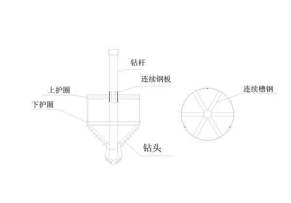 技术团队迅速采购了槽钢、钢板,组织人员对旧钻头进行现场改造:将旧钻头割除上卡扣,取一节2米的钻杆割除其下卡扣后,与钻头相连、焊接,并采用3块钢板帮焊加强,在接口高度处设置一层与原钻杆一致的护圈,护圈内均匀设置六块[14糟钢将护圈与钻杆相连,并采用钢筋将上下两层护圈相连以保证其整体性。