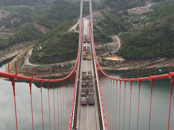 湖北省水布垭清江大桥桥梁荷载试验由武汉马房山理工工程结构检测有限公司实施,项目部协助进行,主要内容为静载试验和动载试验。静载试验采用三轴载重汽车加载,加载重量为24辆35吨载重车。加载过程中每一级都逐级加载,分析结果后确认安全方可进行下一级加载,直至加载结束。最大承重840吨的加载试验,对结构的承载能力和整体刚度提供了有力的证明。动载试验通过脉动试验、行车试验、跳车试验和制动试验测定,对桥梁的动力响应和结构完整性进行了充分的肯定。