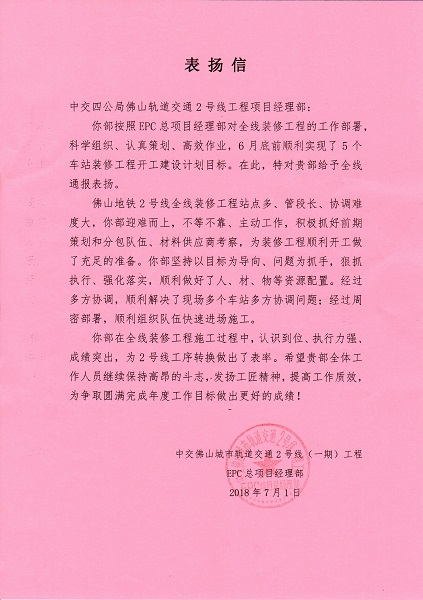 7月3日,铁路公司佛山项目(TJ7标)全线装修工程受到中交佛山轨道交通2号线工程EPC项目总经理部全线通报表扬。