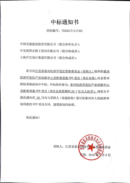 5月9日,在投资事业部、山水公司的积极参与运作下,中国交通建设股份有限公司、中交第四公路工程局有限公司、上海开艺设计集团有限公司联合体中标泰兴经济开发区产业创新中心及配套设施PPP项目,项目总投资约29.7亿元。本项目合作期15年,其中:建设期3年,运营期12年。