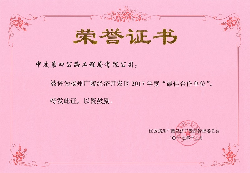 近日,从扬州市广陵经济开发区管委会传来喜讯,建筑公司扬州项目荣获业主单位2017年度“最佳合作单位”荣誉称号。