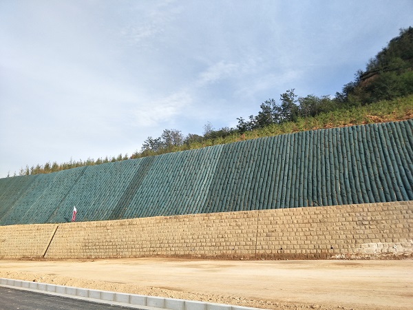 生态袋施工是我项目尝试的一种新型工艺。生态袋又称植生袋,顾名思义,是将土和草籽均匀搅拌后装入可滤性袋内,固定于边坡,植草灌花透过滤孔正常生长与边坡形成一体的过程,是一项真正意义上的生态环保治理技术,不但完美融合于自然,效果突出,而且解决了大面积边坡防护刚性结构无法处理的工程难题,是集环境保护、生态绿化和水土保持三位一体的综合功能,这种新型技术在陕北延安革命老区生态建设中得到了应用和推广