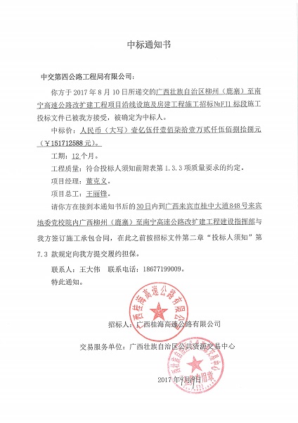 桥隧公司中标1.5亿元柳州(鹿寨)至南宁高速公路改扩建工程项目沿线设施及房建工程施工招标NoFJ1标段