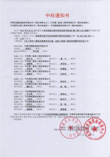 2017年8月21日,在局市场开发部统一安排部署下,一公司、山水公司中标13.54亿元长春至哈林河高速改扩建工程CL01标段GQ05、GQ06、GQ12工区。该项目由中国交通建设股份有限公司牵头,与中交第二航务工程局有限公司、中交第四公路工程局有限公司、中交路桥建设有限公司组成联合体,共同中标京哈高速公路长春至哈林河段改扩建工程CL01标段,总中标额64.26亿元,其中四公局所占中标份额为13.54亿元,具体为GQ05工区5.22亿元,GQ06工区6.34亿元,GQ12工区1.98亿元,项目总工期1116日历天。