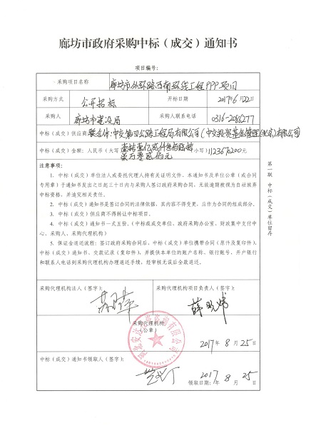 8月25日,在投资事业部的积极参与运作下,中交第四公路工程局有限公司、中交投资基金管理(北京)有限公司联合体中标廊坊市外环路西南环线工程PPP项目,项目总投资约8.01亿元,合作期限11年,其中建设期1年,运营期10年。