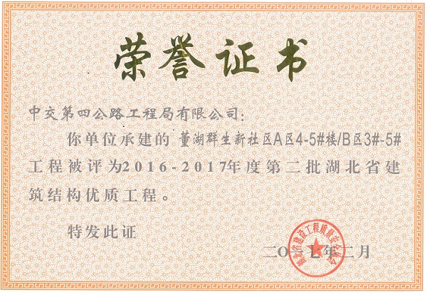 从湖北省建设工程质量安全协会传来喜讯,四公局建筑公司承建的董湖群生新社区项目16栋主楼荣获2016至2017年度“湖北省建筑结构优质工程”奖。