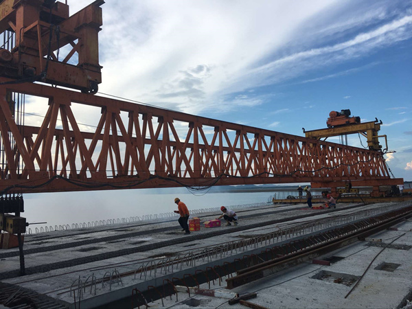 南漪湖特大桥全长3377米,其中主桥上部结构为“40米+70米+70米+40米”变截面连续梁桥方案,引桥上部结构采用30米先简支后连续预应力混凝土小箱梁,单幅每跨4片箱梁。目前,大桥右幅桥面系正在紧张施工中,预计8月中旬完成右幅桥面铺装及护栏施工。