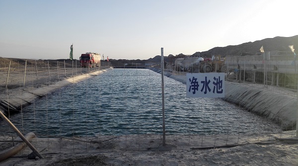 经过研究,项目部投入20多台水车,每天从马鬃山镇拉水。一台水车拉从马鬃山镇购买的净化水,专门供应项目管理人员及作业人员。其他水车从马鬃山镇水源处取水。项目部挖了两个10m×50m×3m的水池,又花了40万元购买了一套净化水设备。从水源处拉回来的水,先倒入原水池,经设备净化后,再进入净水池用于施工。